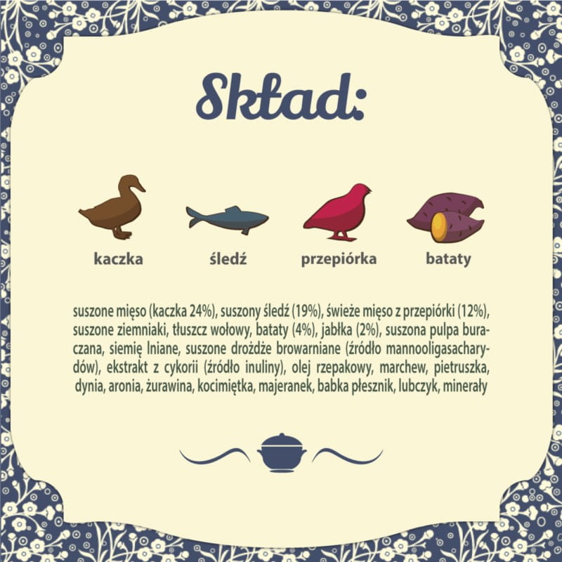 Skład: suszone mięso (kaczka 24%), suszony śledź (19%), świeże mięso z przepiórki (12%), suszone ziemniaki, tłuszcz wołowy, bataty (4%), jabłka 2%, suszona pulpa buraczana, siemię lniane, suszone drożdże browarniane (źródło mannooligasacharydów), ekstrakt z cykorii (źródło inuliny), olej rzepakowy, marchew, pietruszka, dynia, aronia, żurawina, kocimiętka, majeranek, babka płesznik, lubczyk, minerały.