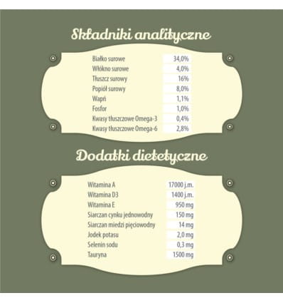 - Kwasy tłuszczowe Omega-3 i Omega-6 oraz cynk - zdrowy wygląd skóry i lśniącą sierść