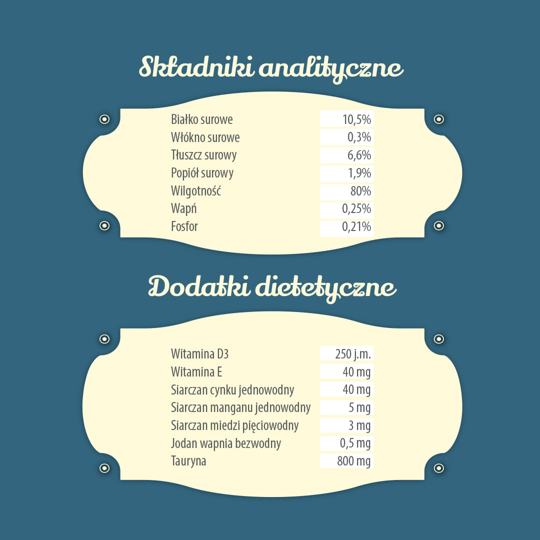 Skład: jagnięcina 75 % (mięso jagnięce, wątroba), bulion, olej z łososia 0,3%, substancje