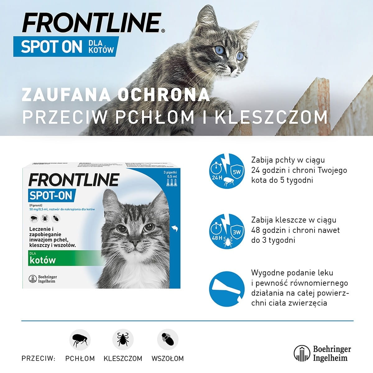 Frontline Spot On Dla Kota 3 x 0,5ml Zwalczanie i Zapobieganie Inwazji Pcheł i Kleszczy u Kotów!
