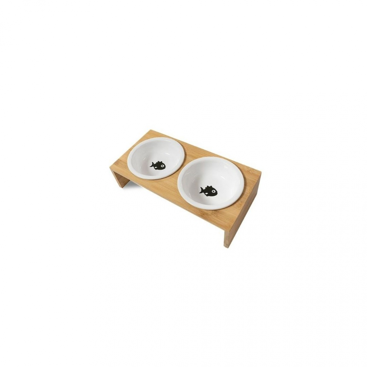 - Stabilny bambusowy stojak z 2 ceramicznymi miseczkami dla kota