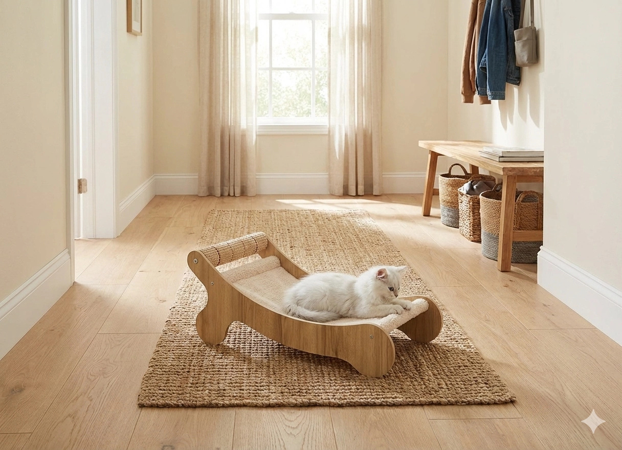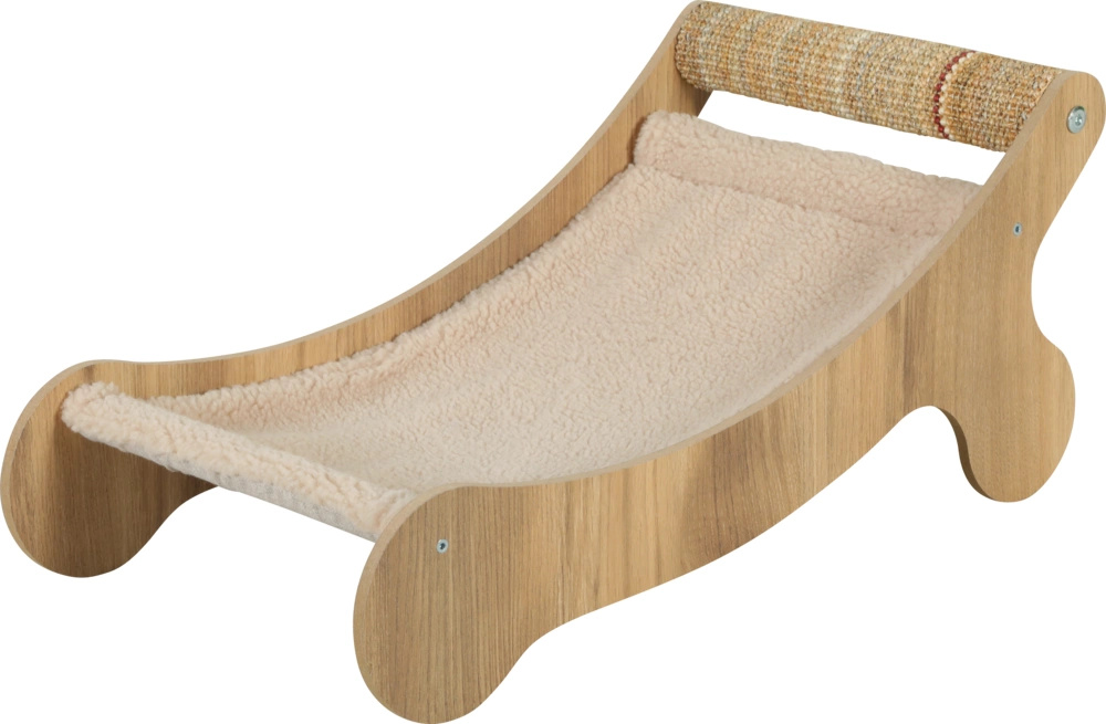 Leżak wykonano z płyty MDF melaminowanego o grubości 8 mm, co zapewnia stabilność i trwałość. Powierzchnia sizalowa służy do drapania, natomiast miękkie legowisko z futra syntetycznego zapewnia kotu wygodę i ciepło. Połączenie funkcjonalnych i estetycznych materiałów sprawia, że produkt doskonale komponuje się z wnętrzem domu.